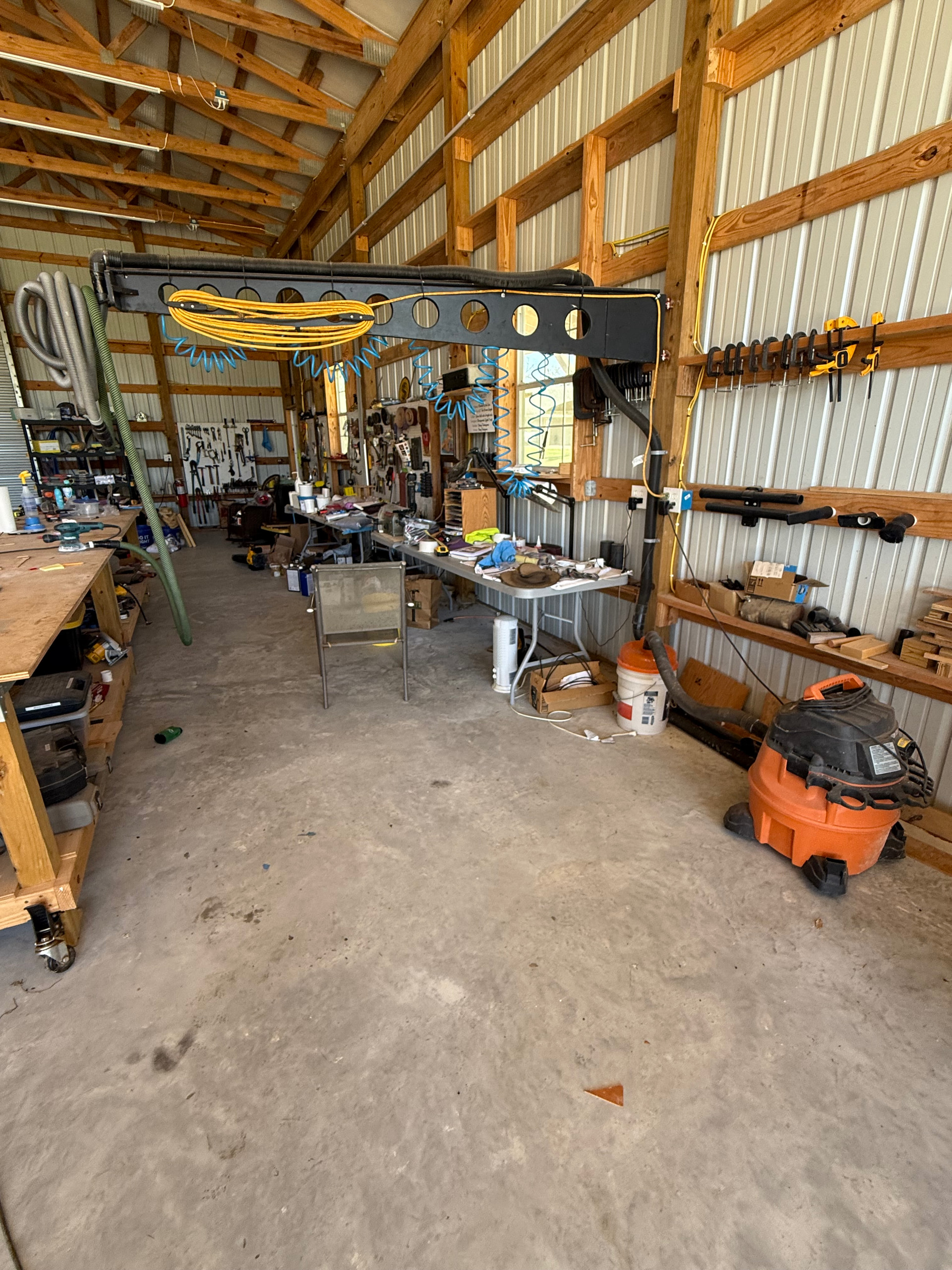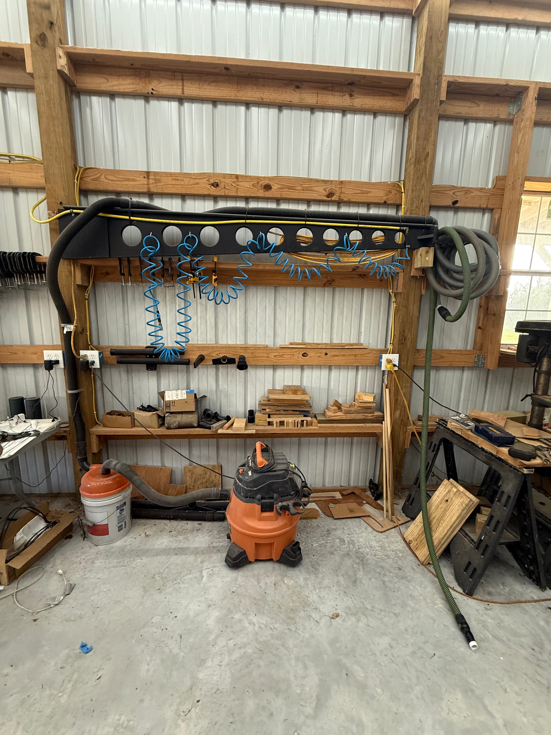 I do have some dust collection stuff that I thought I’d add to the photos. The swing boom I made from scrap, it carries the vacuum hose, air hose and extension cord. The pre-filter on my shop vac that I bought at Home Depot works great.