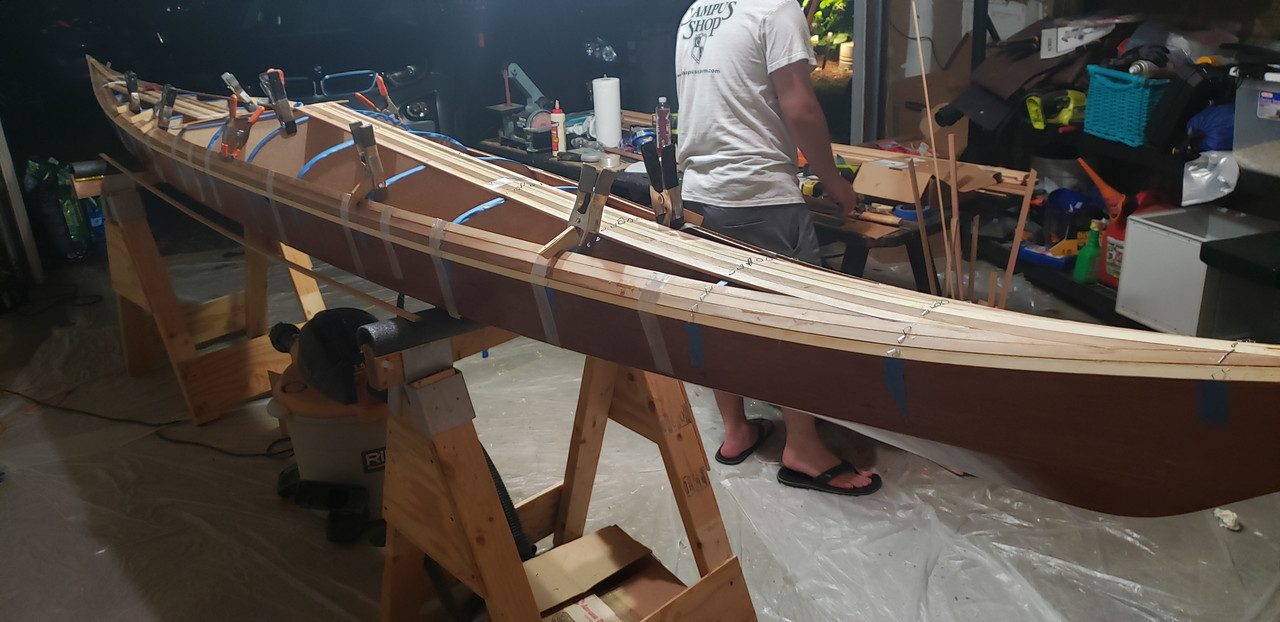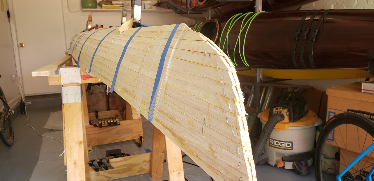 in this build, there was more twist happening and i found strapping tape was necessary to generate the force i need to close gaps/move things around to where i wanted them. notice the wood/clamps are concentrated where there is twist (the face of the strip transitions from horizontal to vertical). it's those sections that tend to be the most challenging.